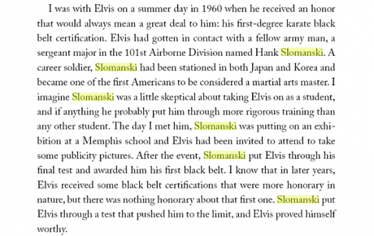 Ralph Jones – a member of the elite (Special Forces in the United States Army, had Command Sgt. Major Henry Slomanski as his instructor for airborne school) relates his eye witness account to Soke Burkhardt “. . . I was there when Presley was awarded his black belt from Slomanski and his instructors. They took him into the gym and locked the door. He was in the gym for over 2 hours and you could hear the thumps outside the building. He surely earned his belt that day.”
